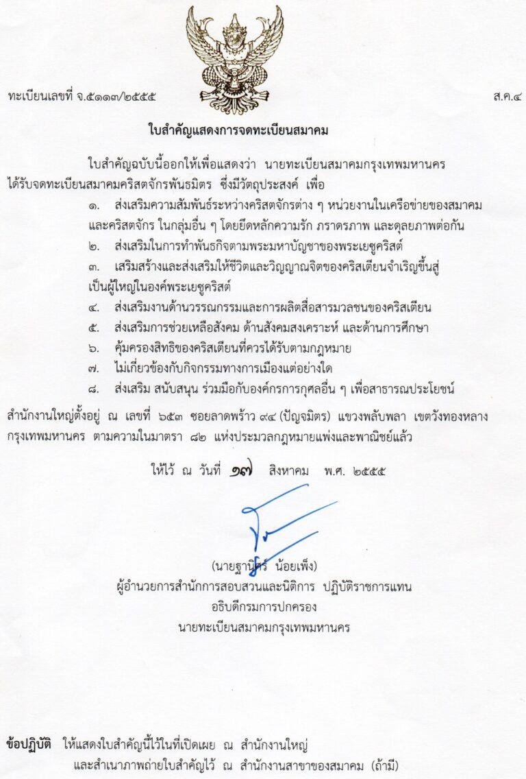 จดทะเบียนกับสหกิจคริสเตียนแห่งประเทศไทย ภายใต้กรมศาสนา กระทรวงวัฒนธรรม ทะเบียนเลขที่ 0270000