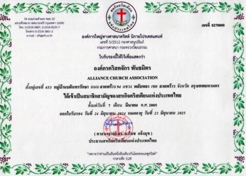 - สมาคมคริสตจักรพันธมิตร จดทะเบียนกับกระทรวงมหาดไทย ทะเบียนเลขที่ จ.5113